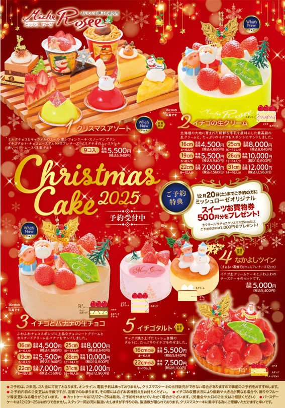 2025.11.01イベント 2025年クリスマスケーキご予約受付スタート🎄✨ 11月に入り今年もミッシュローゼは一大イベントに向けて 今日も一生懸命仕込んでいます♡ 11月1日からクリスマスケーキのご予約がスタート致しました❣ 店頭にてパンフレットをお配りいたしておりますので 是非ご覧くださいませ😊! 12月20日までにご予約下さったお客様には ミッシュローゼでご利用いただけます 500円分のスイーツ券をプレゼントいたします🎁 イベント, お知らせ 関連記事一覧 価格改定のおしらせ 砺波店よりお知らせ 2025年[夏休み限定]ケーキパレード お知らせメールについて【オンライン注文より】 【2025年最後】11月バイキングのお知らせ≪ご予約につい... 焼菓子・クッキーDAYについてのお知らせです☆